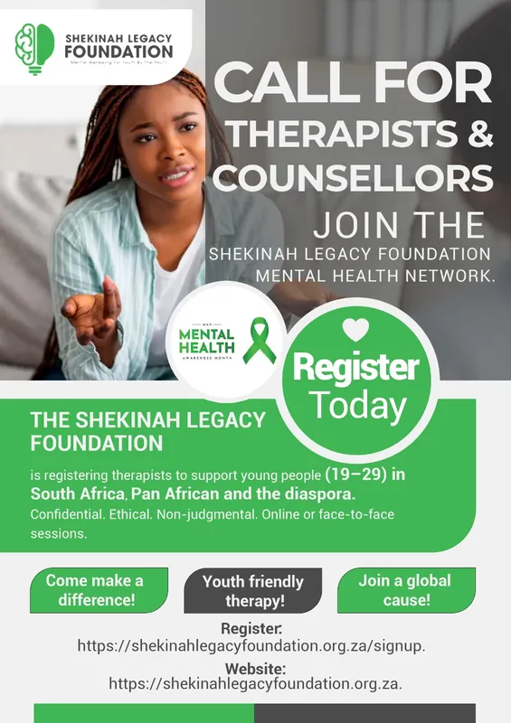 Shekinah Legacy Foundation is building a trusted, safe, and stigma-free network of therapists to support young people aged 19–29, in South Africa, and the diaspora, who lack adequate mental-health support systems.